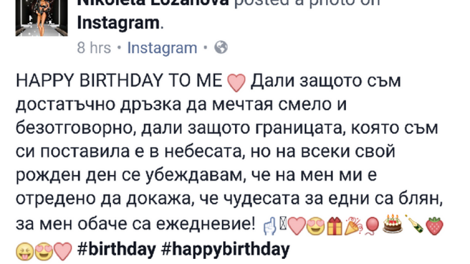 „HAPPY BIRTHDAY TO ME. Дали защото съм достатъчно дръзка да мечтая смело и безотговорно, дали защото границата, която съм си поставила е в небесата, но на всеки свой рожден ден се убеждавам, че на мен ми е отредено да докажа, че чудесата за едни са блян, за мен обаче са ежедневие!“.