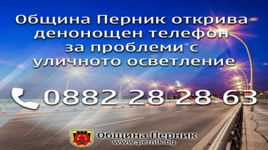 Община Перник открива денонощен телефон за проблеми с уличното осветление. От днес перничани ще могат да звънят на 0882282863 като на него ще се приемат сигнали за проблеми с уличното осветление.