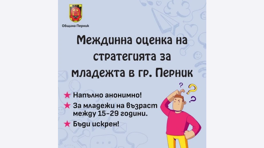 Община Перник стартира междинно изследване сред младите хора на възраст между 15 и 29 години, живеещи или трайно пребиваващи на територията на общината.