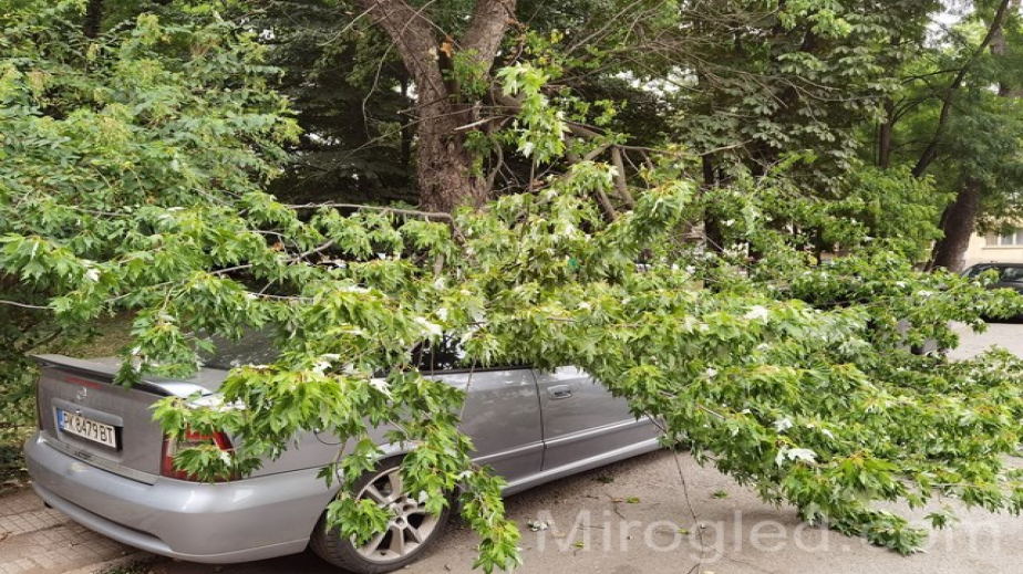 Най-вероятно клонът е паднал в следствие на ветровете, които се извиха в града тези дни. Дали возилото е пострадало може да се види едва когато общинската фирма премахне счупеното дърво от покрива на колата.