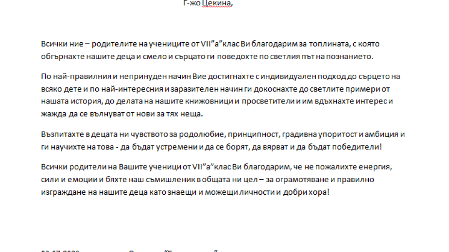 Всички родители на Вашите ученици от VII”а”клас Ви благодарим, че не пожалихте енергия, сили и емоции и бяхте наш съмишленик в общата ни цел – за ограмотяване и правилно изграждане на нашите деца като знаещи и можещи личности и добри хора!” се пише още в благодарственото писмо от родителите от Перник.