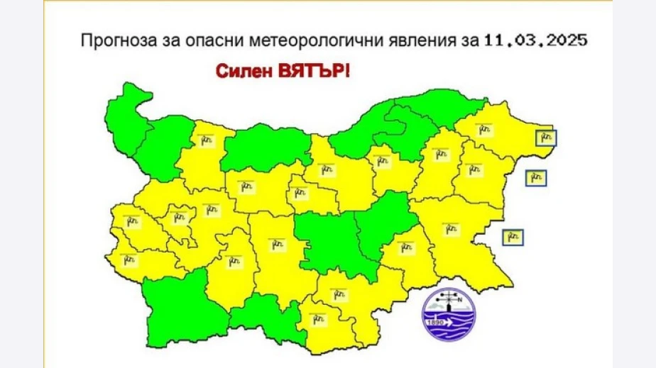 Обявиха жълт код за силен вятър в 18 области у нас – София, София-област, Кюстендил, Перник, Враца, Ловеч, Габрово, Велико Търново, Търговище, Шумен, Варна, Добрич, Бургас, Ямбол, Хасково, Кърджали, Пловдив и Пазарджик.
