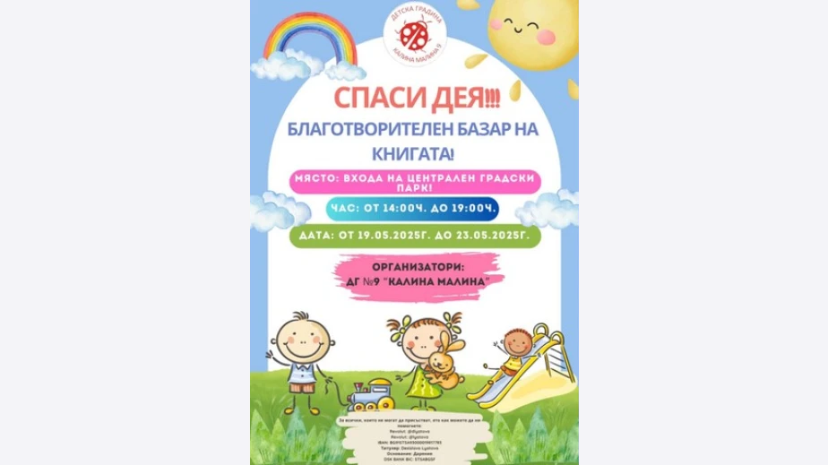 Детска градина №9 "Калина Малина" организира благотворителен базар на книгата под наслов "Спаси Дея!!!", който ще се проведе от 19 до 23 май 2025 г. в Централния градски парк на Перник, при входа. Събитието ще се състои всеки ден от 14:00 ч. до 19:00 ч.