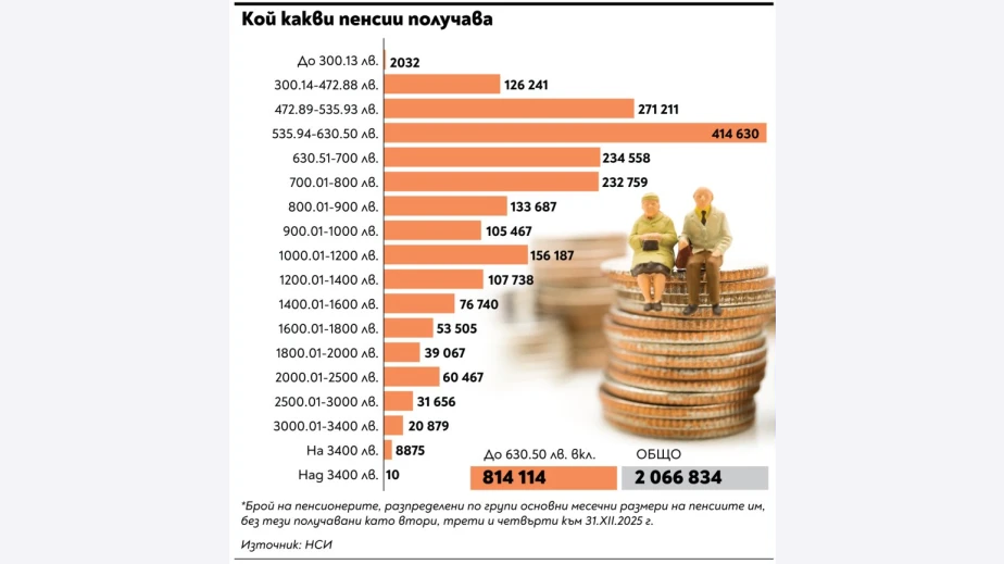 Близо половината пенсионери у нас - 941 155 души, получават някакъв вид минимална пенсия. Това показва статистическият бюлетин “Пенсии” на Националния осигурителен институт (НОИ) за 2025 г.