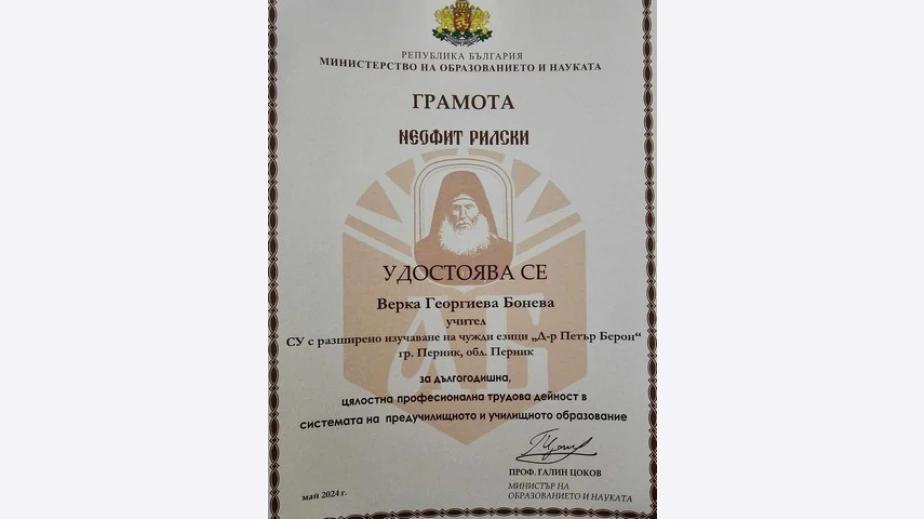 Д-р Верка Бонева спечели приза "Учител на годината" 2024 г. в категория "Професионално образование". Тя е преподавател в СУРИЧЕ „Д-р Петър Берон“ в Перник.