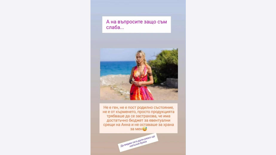 Истината според нея е далеч по-забавна – по време на снимките на „Ергенът: Любов в рая“, целият бюджет бил съсредоточен върху срещите на Анна-Шермин, и просто „не останали пари за храна“ за самата нея. С присъщото си остроумие Райна добавя, че сега остава да се види дали „рязко ще напълни бузки“. Постът й предизвика усмивки сред последователите, които оцениха самоиронията и позитивното й отношение. Караянева за пореден път показа, че може да се шегува със себе си и да приема с лекота любопитството на феновете към външния й вид.