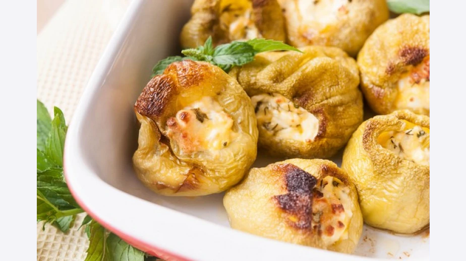Във всяка чушка слагате по малко краве масло, след което ги пълните с подготвената смес. Не препълвайте чушките, за да не прелеят при печене. Намажете малка тава с мазнина и наредете пълните чушки, като не е добре да са легнали, а изправени или полуизправени, за да не се разлива сместа.