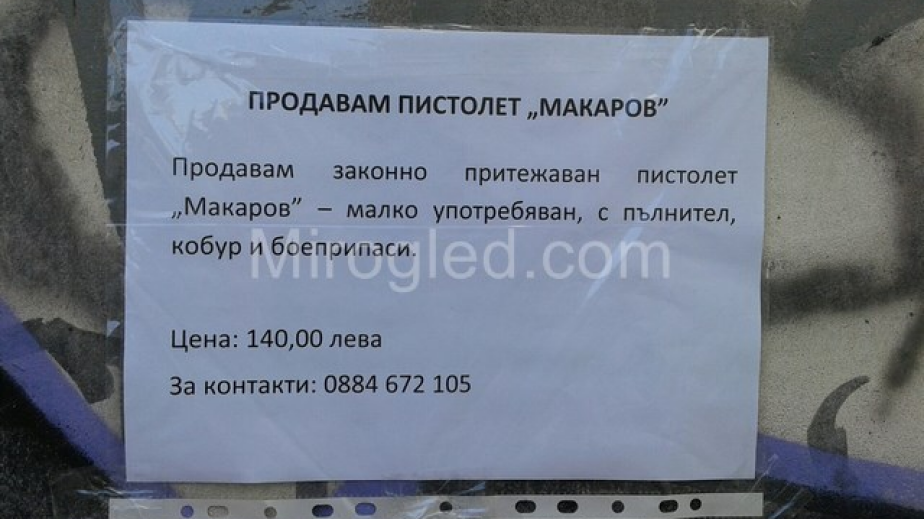 Странна обява е разлепена на сградата на Български пощи в Перник. Гражданин продава пистолет „Макаров“ с пълнител, кобур и патрони. Обявата е написана на компютър, а авторът е посочил и телефон, на който кандидат-купувачите да го търсят.