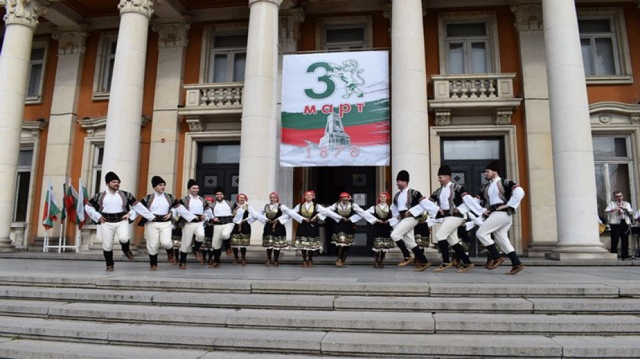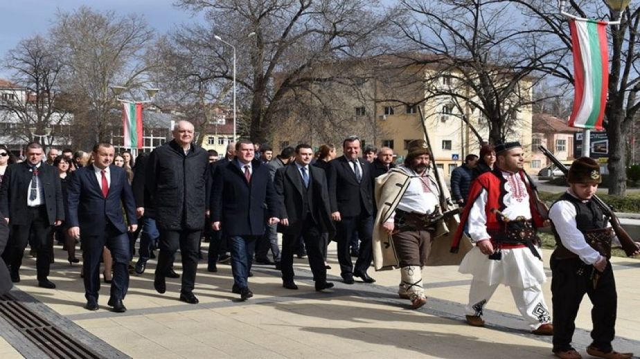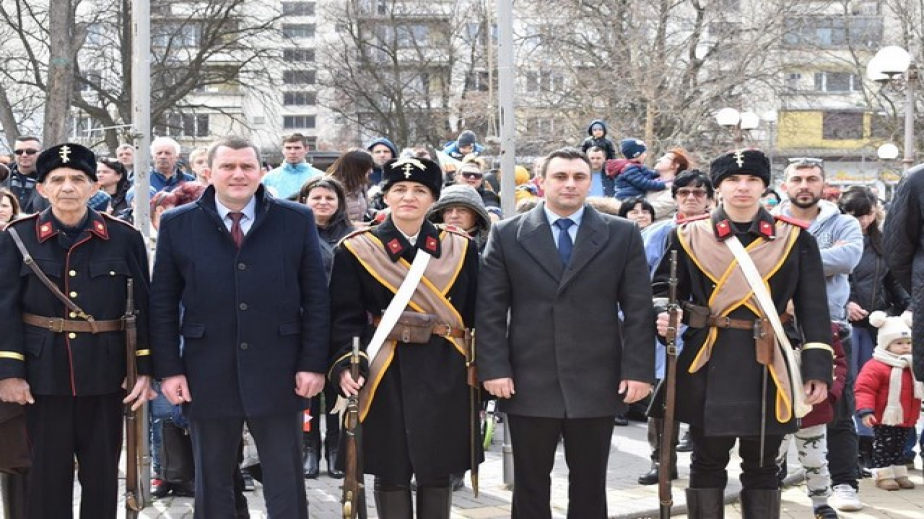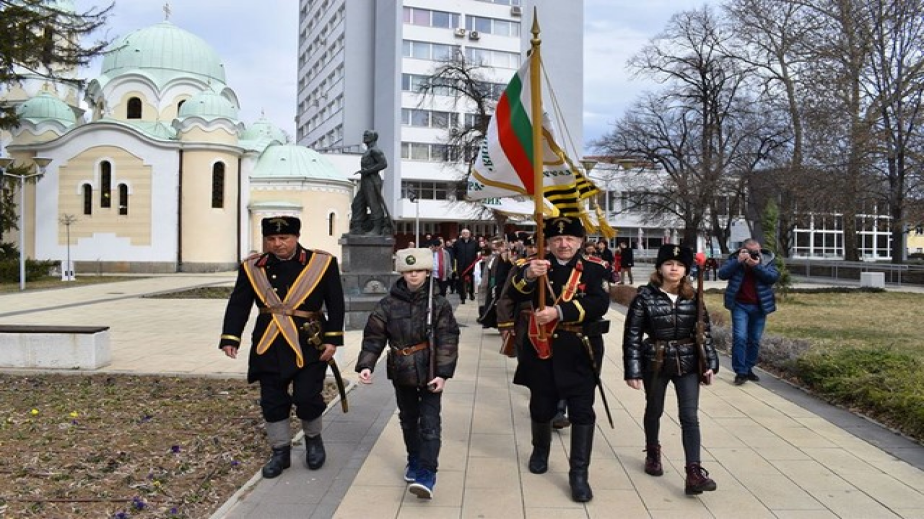 Перник тържествено отбеляза 3 март с празнично шествие и ритуал по издигане на националния флаг пред Двореца на културата.