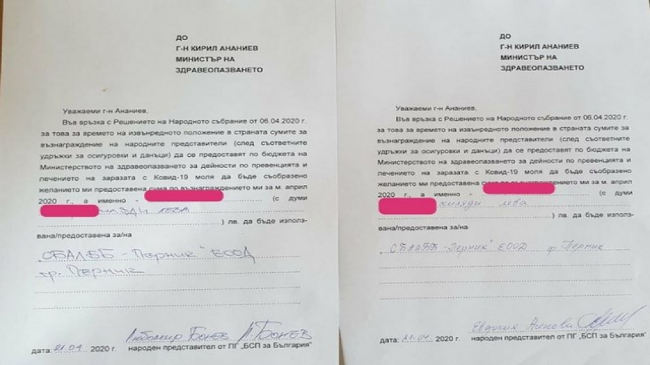 Пернишките депутати от БСП Евдокия Асенова и Любомир Бонев са изпратили писмо до здравния министър Кирил Ананиев, в което са заявили желанието си на кое лечебно заведение да бъдат преведени заплатите им за април. Те са избрали да помогнат на Белодробната болниц.