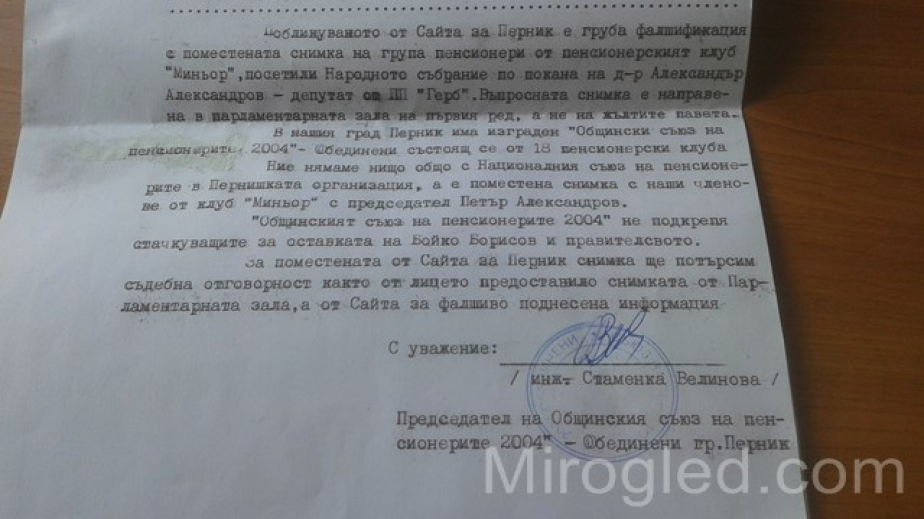 Вчера в друг пернишки сайт е излязла невярна статия относно становището на възрастните хора от миньорския град, придружена със снимка на старите хора от Перник, която изобщо не е от „жълтите павета“, а от Парламента, където пенсионерите от Перник са били на посещения през 2019 г. по –покана на депутата от ГЕРБ д-р Александър Александров.