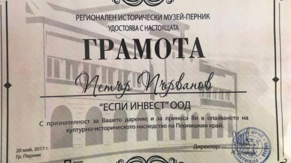 Петър Първанов получи и специална благодарствена грамота за дарение и за извършения от неговата фирма основен ремонт на стълбищната клетка в Регионалния исторически музей в Перник.Призът, Петър Първанов получи лично от директора на музея Венцислава Крумова.