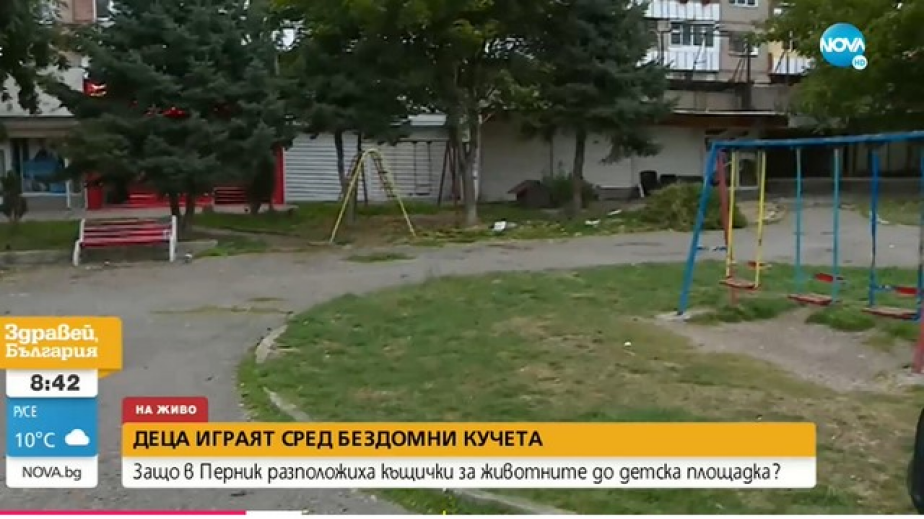 Детска площадка в Перник осъмна с чисто нови къщички за бездомни кучета. Поставянето им предизвика сериозно недоволство от страна на родители, които твърдят, че част от животните са агресивни и представляват опасност за децата им.
