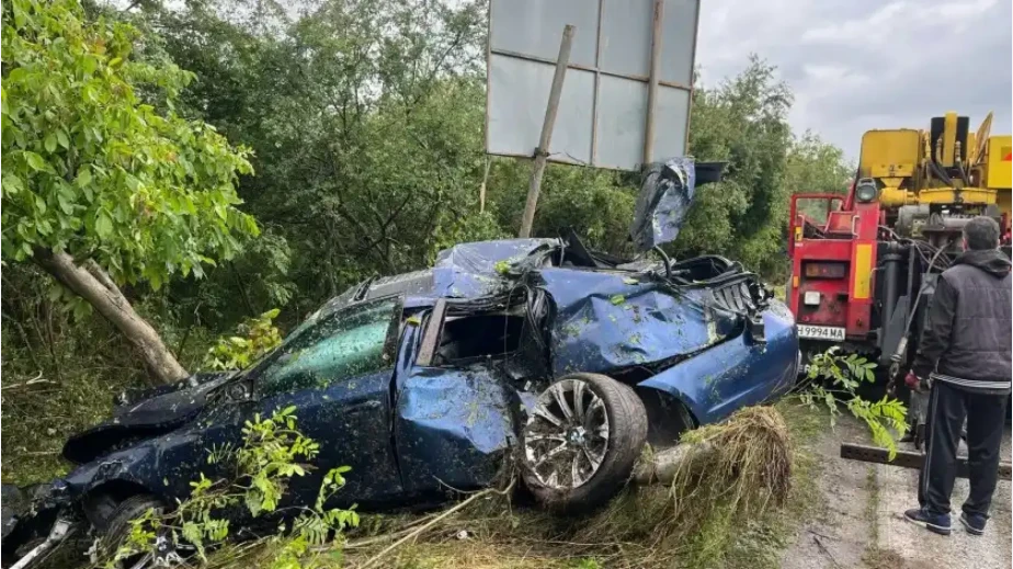 Синьото BMW е смачкано до неузнаваемост. Дървета – съборени. Части – разхвърляни. Колата – изхвърлена в канавката. Причината? Вероятно аквапланинг. Истинската причина? Безотговорност. Несъобразена скорост. И системна некомпетентност зад волана.