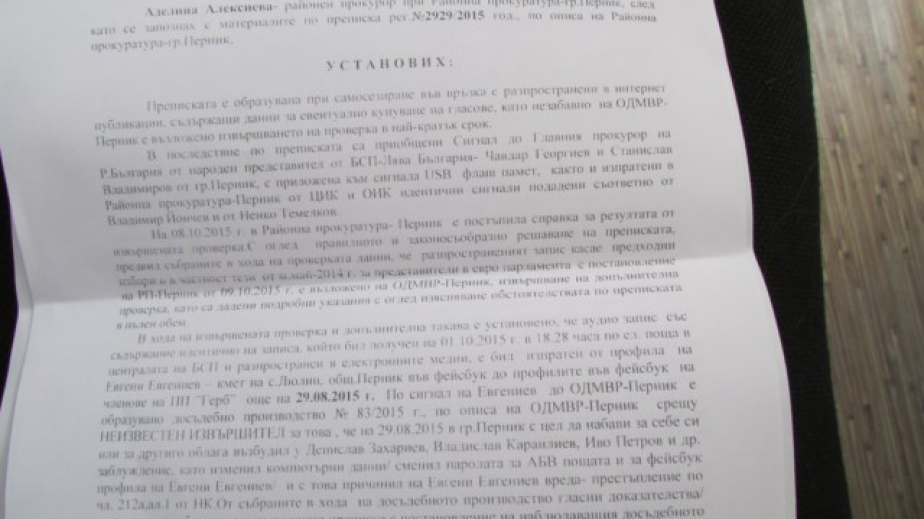 Преписката бе образувано при самосезиране на прокуратурата във връзка с разпространение в интернет на запис с данни за купуване на гласове. В последствие към сигнала са приобщени Чавдар Георгиев и Станислав Владимиров от БСП.