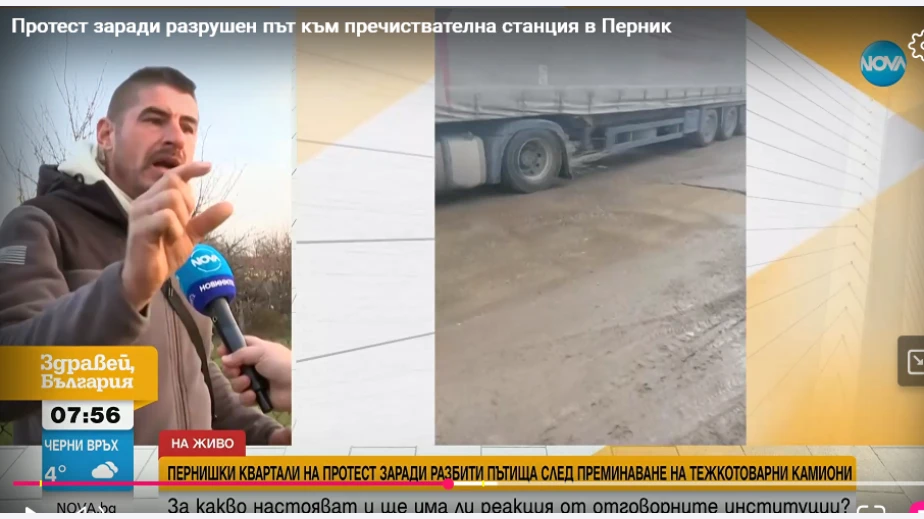 Жители на няколко пернишки квартала излязоха на протест заради окаяното състояние на пътя към пречиствателната станция в квартал "Църква". Според недоволните граждани пътят е напълно разрушен от тежкотоварни камиони и е станал опасен и непроходим. Те настояват за спешни мерки от страна на общината и заплашват с ежедневни блокади, докато институциите не реагират
