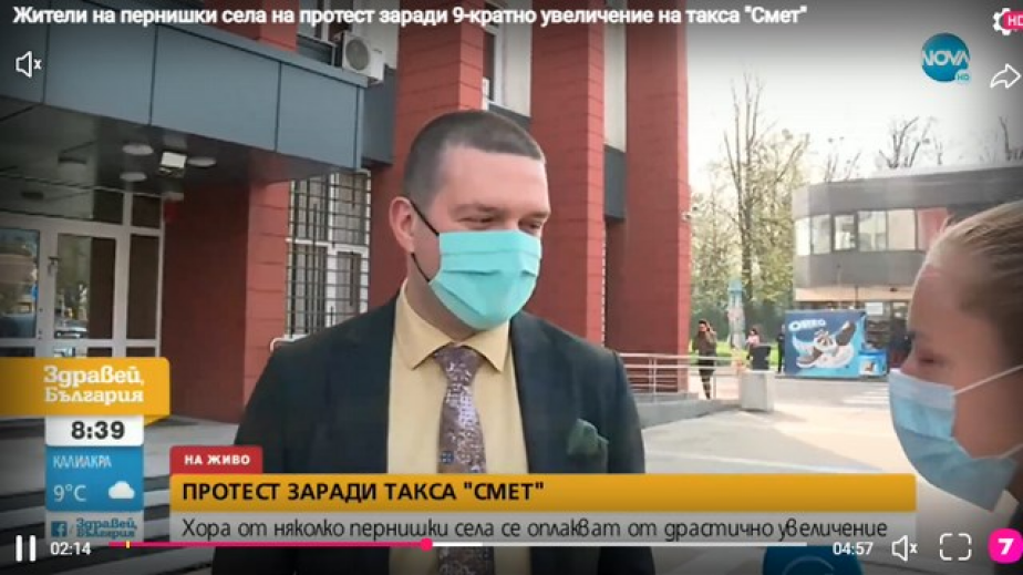 Жителите на няколко пернишки села излизат на пореден протест. Причината е деветкратното увеличаване на такса - "Смет". Те се събраха пред сградата на съда в Перник. Заведено е и дело след подадени жалби до Административния съд. Средната цена, която хората са плащали до момента, е между 20 и 50 лева. След увеличението цените скачат драстично – до над 700 лв.