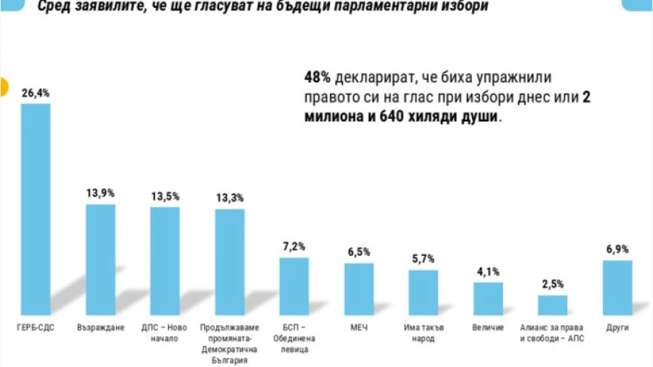Следват ги БСП-ОЛ със 7.2%, МЕЧ с 6.5% и ИТН с 5.7%.