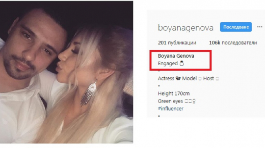 Плеймейтката Бояна Генова се сгоди. Блондинката се похвали сама за щастливото събитие в социалните мрежи. Красавицата, която се изявяваше като актриса в риалити сериала „София ден и нощ“, от лятото е щастливо обвързана, а очевидно и сгодена от няколко дни. Поне така сама съобщи в Инстаграм. В информацията си, която е достъпна за всички потребители, Генова добави и „Сгодена“, пише „Телеграф“.
