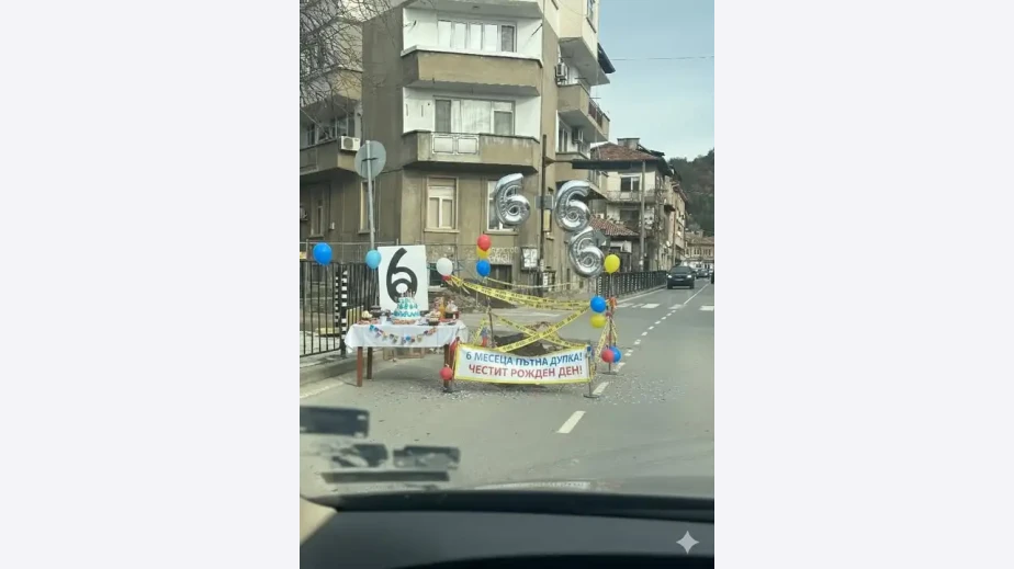 Пред нея е поставена масичка с торта и транспарант с надпис: "6 месеца пътна дупка. Честит рожден ден!".
