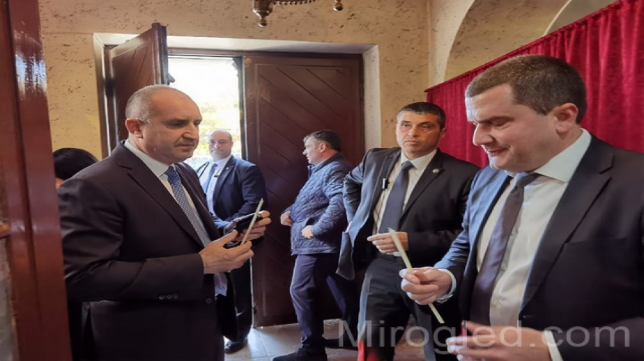 Държавният глава влезе в черквата „Св. Иван Рилски“, където запали свещ за здраве. На излизане пък получи букет от здравец от жената, която продаваше цветя през храма. След това Радев се отправи на среща с интелектуалци и спортисти на Перник. На нея присъстваха световния шампион по борба Иво Ангелов, етнологът Цветана Манова, пернишката футболна легенда Велизар Димитров, световната шампионка по таекуондо Василена Йорданова и др.