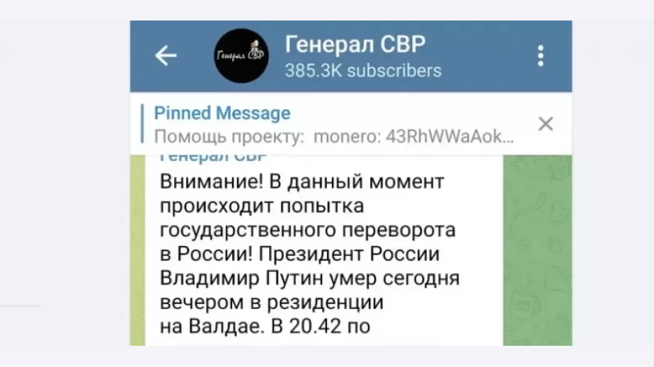 "Лекарите останаха в капана на стаята с трупа на президента. Служителите на службите за сигурност казаха на медиците да се успокоят, да не вдигат шум и да изчакат. По нареждане на Кочнев е засилена охраната и на двойника на президента. Въпросът вече е решен, включително и за бъдещата съдба на лекарите. Взето е решение за запазване на сегашния режим и използване на двойника на Путин в образа на президента. НО!!! Ако докато Путин беше жив, беше възможно да се използва двойник без особени проблеми, сега след смъртта на държавния глава всеки опит да се представи двойникът за президент е държавен преврат“, гласи още съобщението в канала.