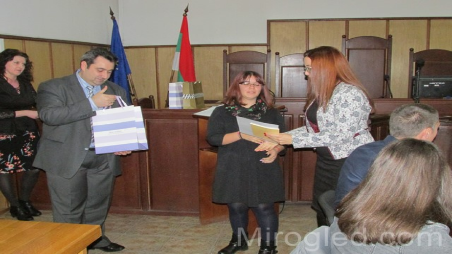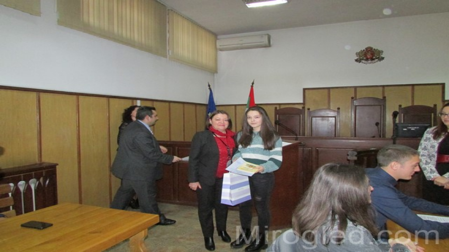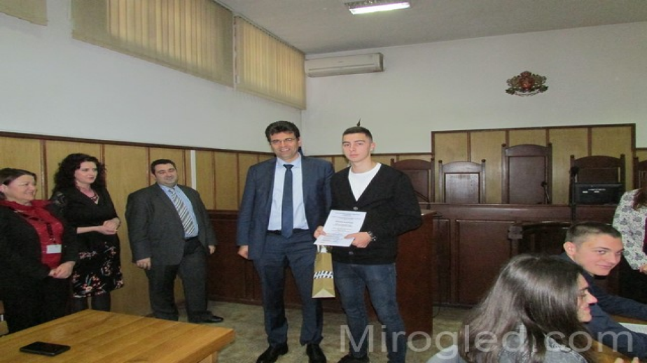 Комисия излъчи трите най-добри есета. Първа награда присъди на Александър Атанасов, 11 а клас, ПМГ „Христо Смирненски“, втора награда – на Ивана Иванова, 10 а клас, ГПЧЕ „Симеон Радев“, а трета награда - на Стела Стефанова, 11 в клас, ГПЧЕ „Симеон Радев“. Победителят получи като подарък таблет. Неговото отличие връчи лично председателят на Окръжния съд Калин Баталски.