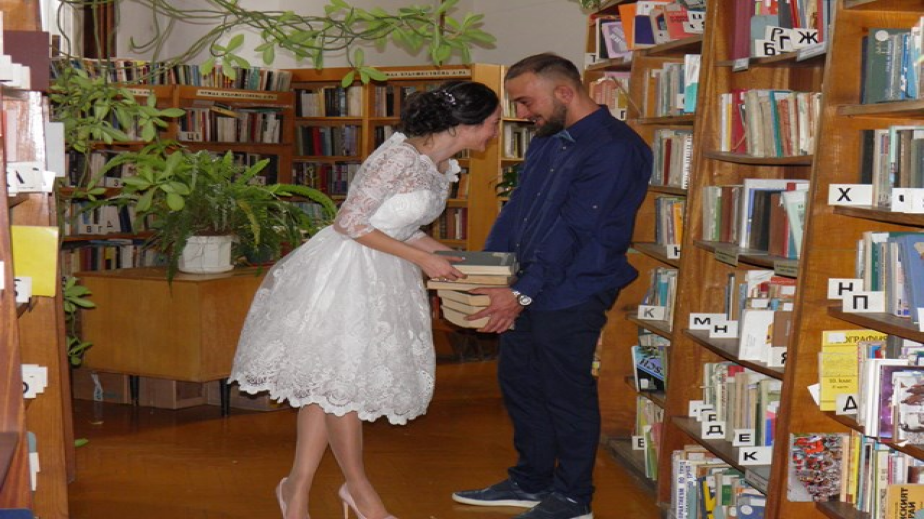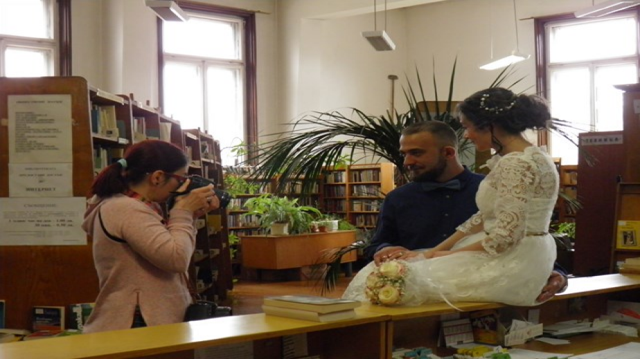 Младоженците Ива и Радмил, които в петък сключиха граждански брак, избраха да излязат от клишето и направиха сватбената си фотосесия в библиотеката. Никоя двойка досега не е избирала интериора на библиотеката за сватбените си снимки и това се случва за първи път. Идеята за това е на младоженката, която работи като учителка в детска градина „Райна Княгиня".