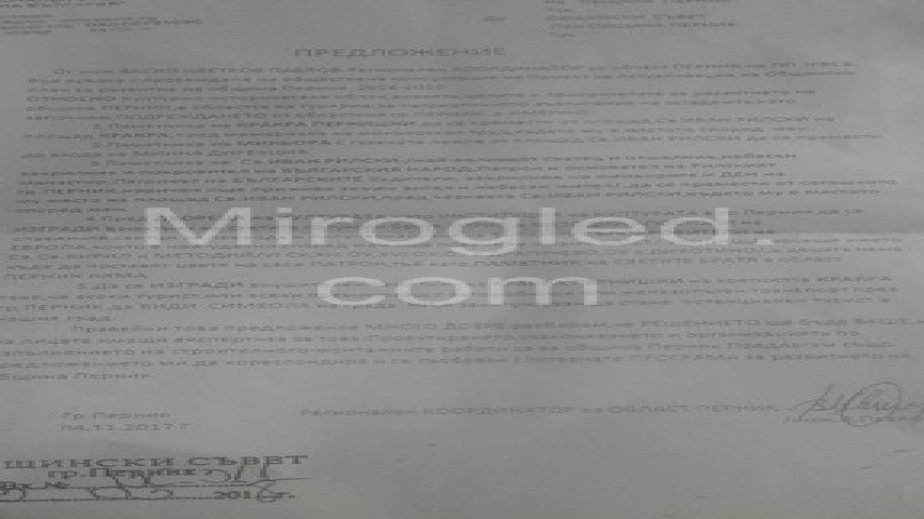 Той поясни ясно и категорично, че на 11 ноември 2017г., лично е внесъл своето предложение за разглеждане в Община Перник, а от 23 май 2018г., то е достигнало вече и очаква своето становище от Общинския съвет на града.
