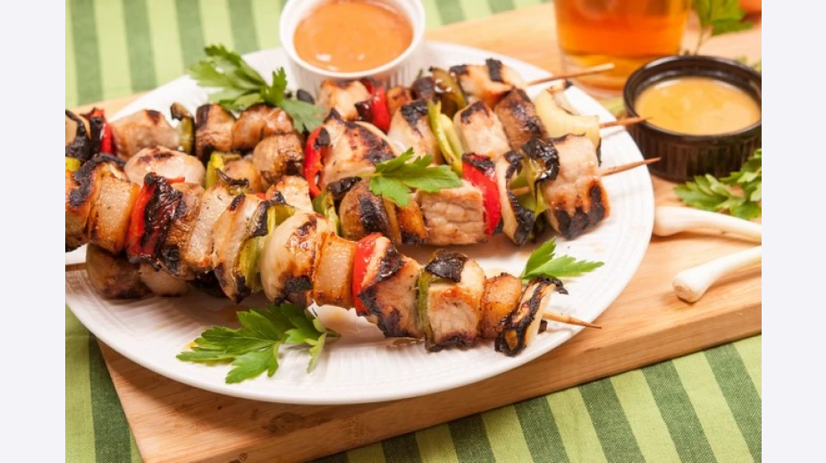 След като месото и гъбите са се овкусили добре, наредете шишчетата, като започнете с зеленчук и продължите с останалите съставки, като ги редувате. Печете на скара или барбекю на умерено силен, но не прекалено силен огън като завъртате на няколко минути, за да се изпекат от всички страни. /Рецепта на supichka.com