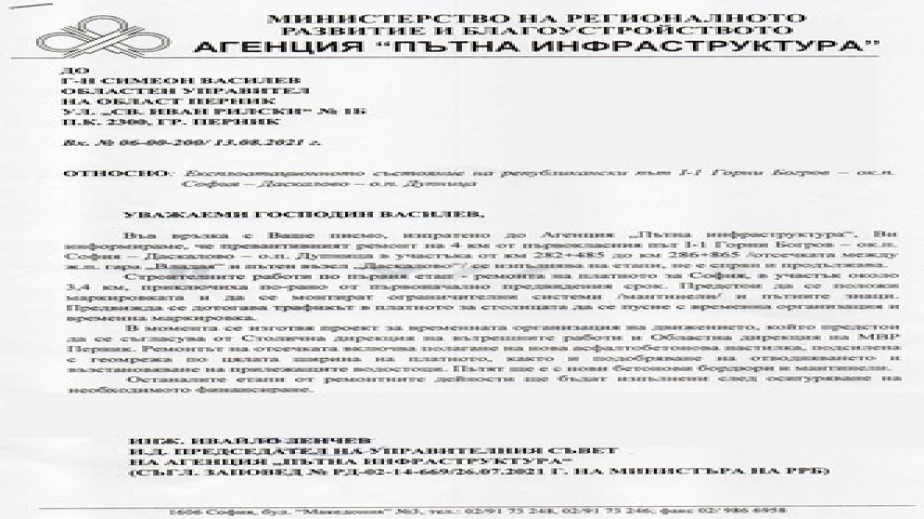 От пътната агенция пишат още, че в момента се изготвя проект за временна организация на движението, който предстои да бъде съгласуван със СДВР и ОДМВР-Перник.