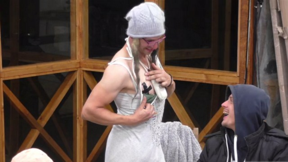 Даяна също се включи в предизвикателството като виртуозно имитира плешивия Боби, след като напъха дългата си коса под шапка от лейкопласт и си измайстори огромни уши като неговите. Строителят не й остана длъжен и все още в ролята на Ханджиева, показа на всички зърната на гърдите си, скрити под черни лепенки, поставени на кръст./Източник: Лупа.бг