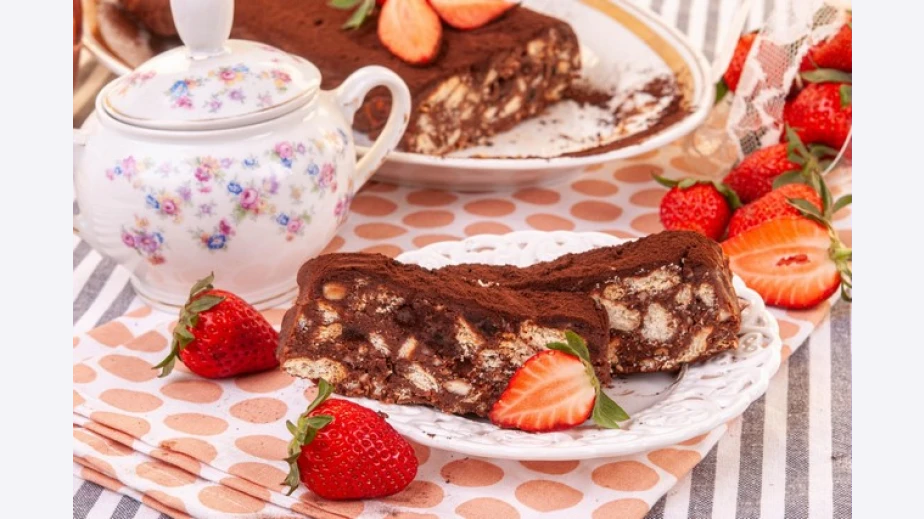 Изсипвате шоколадовата смес към бисквитите и разбърквате старателно, докато шоколадът се разпредели равномерно в цялата купа. Във форма за кекс поставяте прозрачно домакинско стреч фолио, като имате предвид, че трябва да е по-голямо от формата, за да може да се завие в последствие тортата. Изсипвате сместа във формата, завивате с фолиото и притискате плътно с ръце. За приготвянето на тортата може да използвате кръгла форма или форма за терин. Оставяте тортата да престои няколко часа на струдно, най-добре в хладилника. След няколко часа поставяте тортата в подходяща чиния, отстранявате фолиото, поръсвате с какао и украсявате пресни плодове. /Рецепта на supichka.com