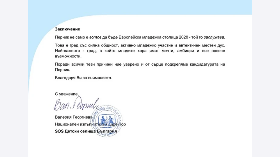 „Перник е град с младежки дух, силна общност и ясно желание за развитие. Виждаме ежедневно потенциала на младите хора тук“, посочват от SOS Детски селища България в официалното писмо, изпратено до журито.