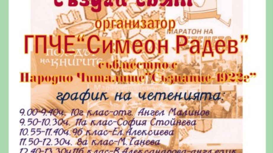 „Сподели книга, създай свят” е посланието на Маратона по четене, организиран от ГПЧЕ”Симеон Радев” и читалище „Съзнание” по повод Деня на книгата. Събитието ще се проведе в галерия „Марин Гогев”, квартал Изток, на 21 април от 9.00 до 15.00 ч. В него ще вземат участие ученици от 10 „г”, 11”а”, 9„б”, 8 ”а”,11 „б” и 10 „в” кл. на Езиковата,заедно със своите преподаватели по Български език и литература