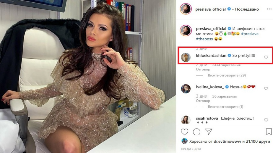 Преди ден изпълнителката на „Да гори в любов”, сподели кадър на който позира в нежна блестяща рокля с дълги ръкави. Седнала на бял кожен стол в офис "И шефският стол ми отива", гласи посланието към изображението. Фотографията подобно на всички останали в профила на брюнетката, бързо събра хиляди харесвания, а нейните последователи я обсипаха с комплименти. За Голяма изненада на всички обаче Клои Кардашиян също не остана безразлична към снимката. "Много си красива", написа тя. Думите й смаяха феновете на Преслава Понеже никой от тях не е очаквал Клои да се включи в коментарите. Много от потребителите дори изразиха писмено изумлението си в публикацията. Самата певица отговори с благодарност и постави емотикон във формата на сърце, пише Телеграф.