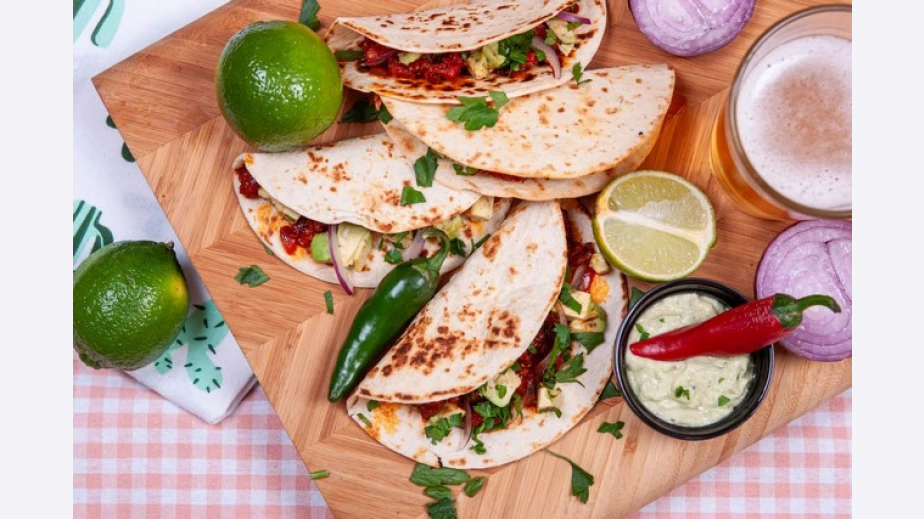 Нарязвате 1 брой авокадо на кубчета, а останалата половина червен лук на тънки ивици. Затопляте всяка такос питка в сух тиган, прегъвате на две и пълни със сместа с чоризо, кубчета авокадо и малко червен лук. Поръсвате с прясно изцеден сок от лайм и ситно нарязан магданоз.
