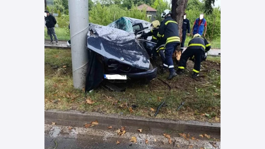 Лек автомобил БМВ се е забил в дърво. След подаден сигнал на телефон 112, на място са пристигнали два екипа на пожарната, полиция и линейка.