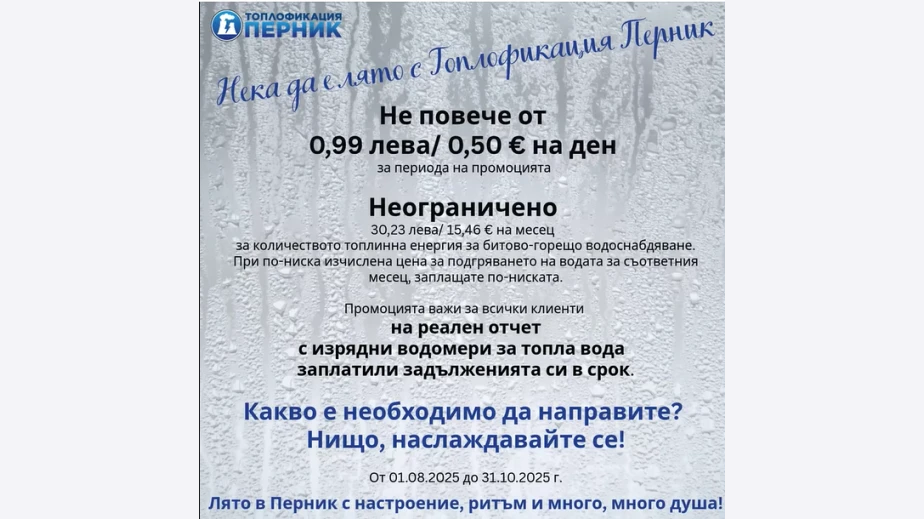 Пернишкото топлофикационно дружество стартира лятна промоция за своите абонати от днес.
