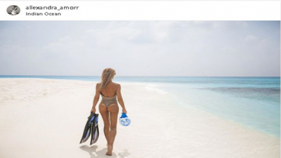 На друга снимка от ваканцията тя отново е в гръб и с цял бански, а краката й изглеждат безкрайно дълги. На фотоса си личи, че Алекс е тръгнала да се гмурка, защото държи плавници и очила. "Търсенето на Немо", кратко е коментирала снимката тя.