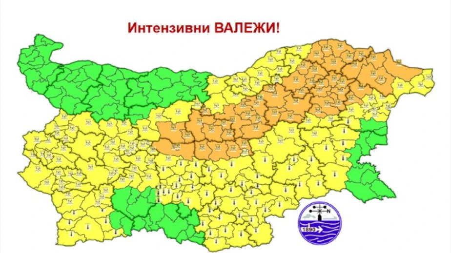 Оранжев код за опасно време - краткотрайни интензивни валежи и гръмотевични бури – е обявен в 11 области на страната: Добрич, Силистра, Разград, Шумен, част от Варна, Търговище, Велико Търново, Габрово, части от Старозагорска, Ловешка и Пловдивска област. По-ниската степен – жълт код за потенциално опасно време, високи температури, но и дъжд с гръмотевици е обявен също в 11 области: Русе, Бургас, Сливен, Ямбол, Хасково, Кърджали, София област, София град, Перник, Кюстендил и Благоевград. В зелено и безопасно картата е само за Видин, Монтана, Враца, Плевен и Смолян.