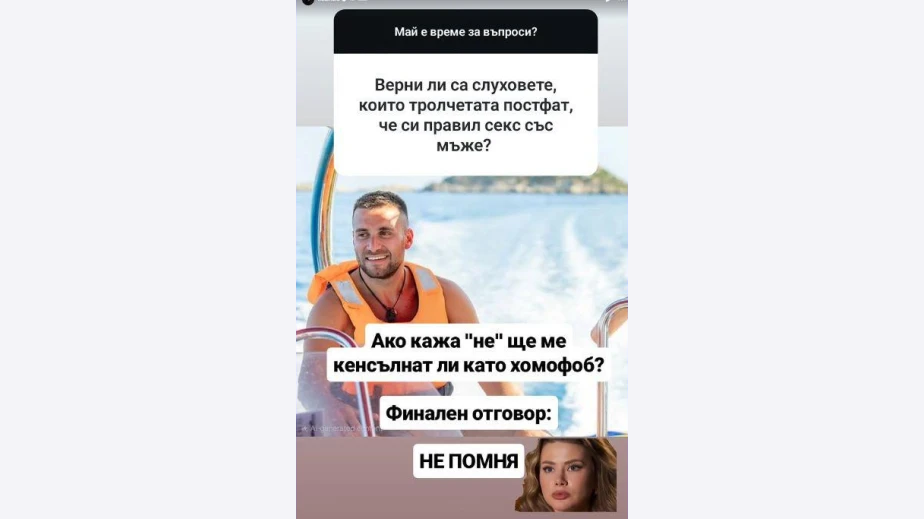 „Сега... ако кажа, че не съм, ще решат, че съм хомофоб. Ако кажа, че съм, ще рекат, че съм гей... Така че – не помня. Да, това е откровеният ми отговор – не помня“, отсече Виктор. В което, разбира се, всички видяха страшна ирония към гаджето му Кристина, твърдяща, че не помни да се е запознавала с Калоян преди година в столична дискотека.