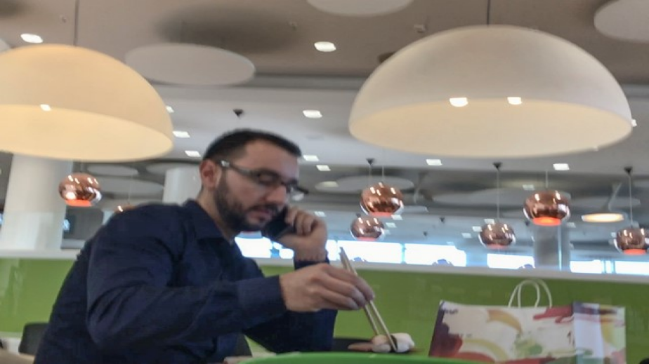 И въпреки, че я остави на съмнително чистите плочки, все пак водещият не е докрай скаран с хигиената, защото след писоара се отправи към мивката и си изми ръцете. И добре, че го направи, защото от там директно се отправи към една от закусвалните в мола и набързо погълна голяма порциа суши, служейки си умело с клечките.