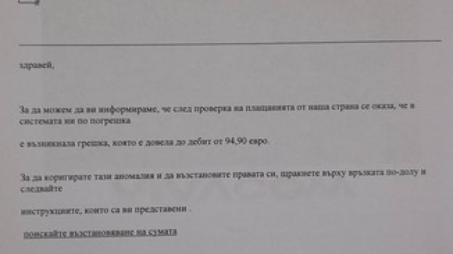 Това накарало перничанката да се усъмни и да не попълни празните полета. След като се вгледала по-внимателно, забелязала, че разширението на изпратения имейл е с букви, които по никакъв начин не съответстват на тези, пращани от мобилния оператор. Посочената сума пък била в евро, а не в лева.