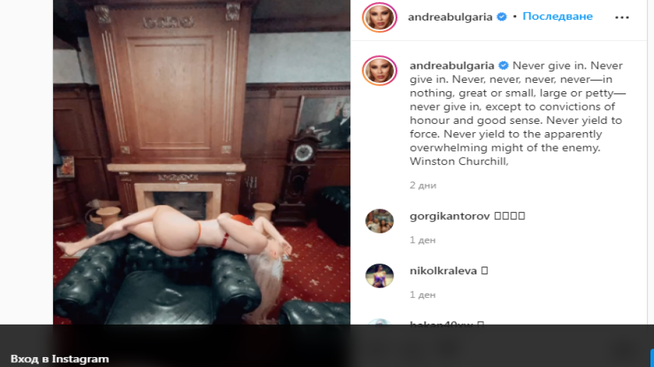 Вулгарното поведение Андреа вече минава всякакви граници. Блондинката сама си пусна видео, достойно за някой порно канал. Бившата половинка на Кубрат Пулев се чуди как да стане отново интересна и да привлече вниманието отново към себе си. Блондинката се похвали с безумно видео по гол задник. Видеото е меко казано отвратително, а за да е още трагично-комично, чалга дивата цитира Уинстън Чърчил, забеляза Lupa.bg.