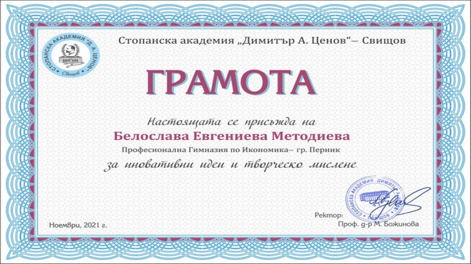 Белослава е ученичка от 12 Б клас специалност „Икономическа информатика“ от „Професионална гимназия по икономика“ ,с ръководител Симона Кирилова, учител практическо обучение. Тя е удостоена с „Грамота за иновативни идеи и творческо мислене“ и сертификат за отлично представяне в конкурса, който и гарантира първа избрана специалност в Стопанска академия “Д.А.Ценов” за учебната 2022-2023г.