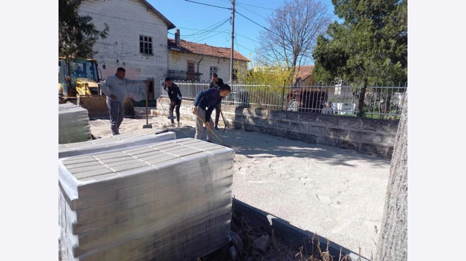 Предстои преасфалтиране на дворното пространство и възстановяване на част от оградата. Пред входа на училището се подменят тротоарните плочки.