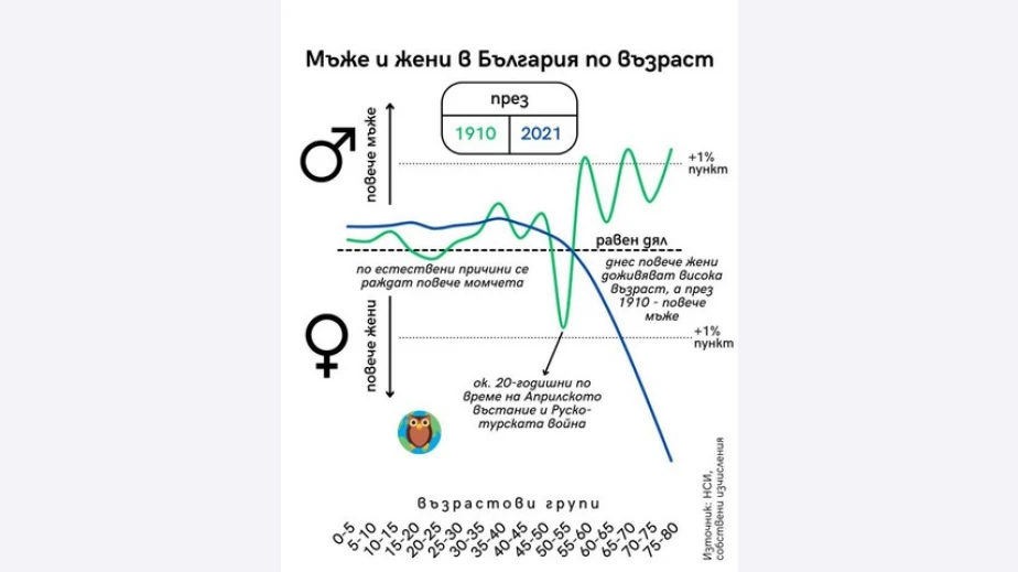 Графиката представя кой пол има числово преимущество по възрастови групи, сравнявайки преброяванията през 1910 и 2021. Макар на практика това преимущество да не е високо в повечето случаи, разположение на кривата над оста за “равен дял” показва повече мъже, а под нея - повече жени. Вижда се нарастващият превес на жените над 60 в наши дни, който обаче няма съответствие в началото на миналия век.