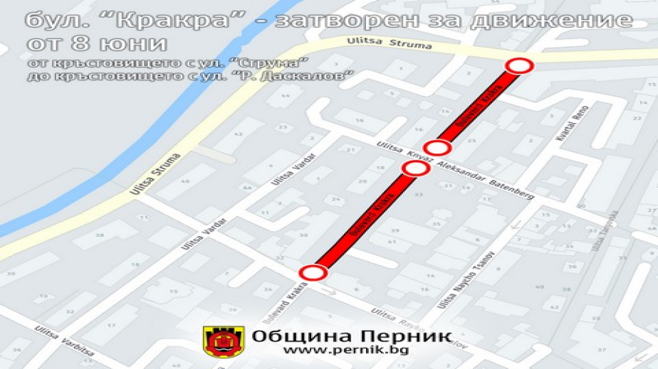 Временна организация на движението се въвежда по ул. "Кракра" в Перник от понеделник - 8 юни. Тя е във връзка с подмяна на водопроводната мрежа.