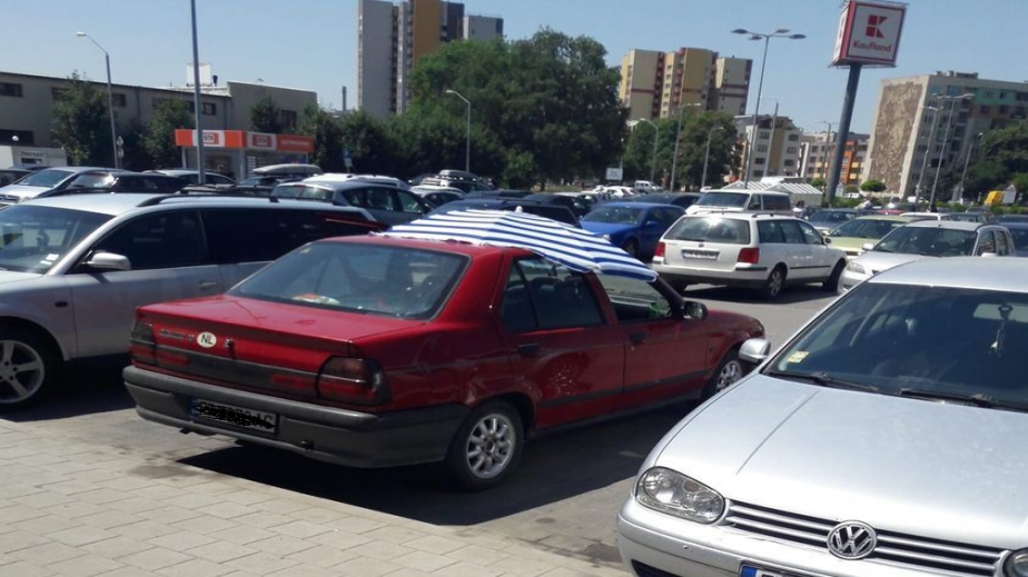 Уникален фотос на лек автомобил, върху който е разпътант плажжен чадър развесели мрежата. Той е направен от Андрей Андреев на паркинга на един от хипермаркетите в кв. „Изток“ в Перник.